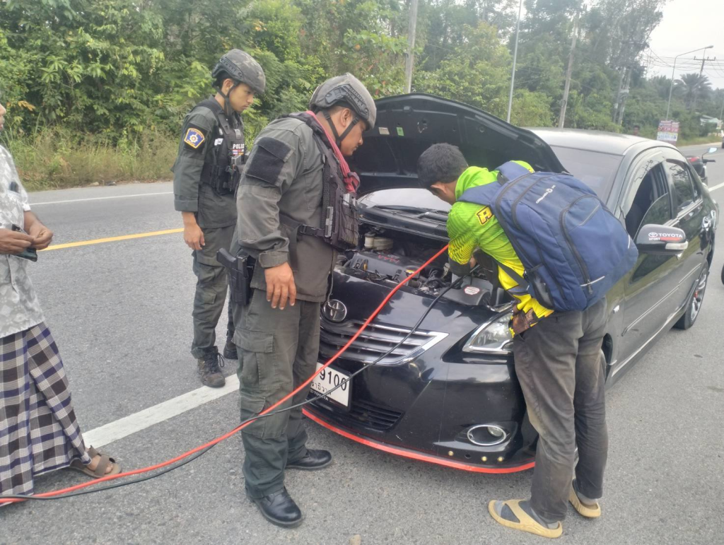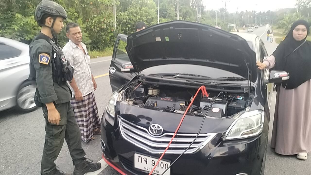 ว.4 ช่วยเหลือชาวบ้านรถเสียบริเวณบนถนนเส้นหลัก 4060 ตะโล๊ะหะลอ – รือเสาะได้ทำการช่วยเหลือชาร์จแบตเตอรี่เพือให้รถขับต่อไปได้