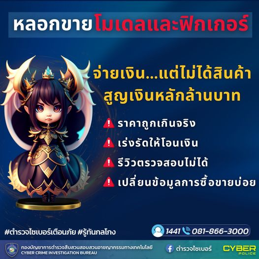 ตำรวจไซเบอร์เตือนภัย หลอกขายโมเดลและฟิกเกอร์ กลโกงของคนร้าย : 1. เปิดเพจขายโมเดลและฟิกเกอร์ 2. โพสต์
