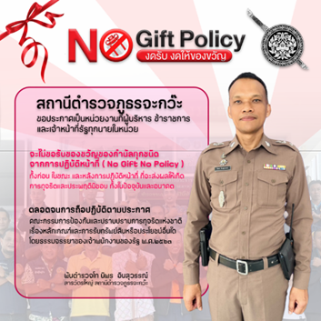 พร้อมข้าราชการตำรวจเเต่ละสายงาน ร่วมประกาศเจตนารมณ์ไม่รับของขวัญเเละของกำนัลทุกชนิดจากการปฏิบัติหน้าที่ พร้อมทั้งอบรมเเละเสริมสร้างความรู้ โดยกำชับให้หัวหน้างาน สร้างความรู้เเละความเข้าใจให้ข้าราชการตำรวจภายใต้บังคับบัญชา ได้เข้าใจเเละรับทราบ
